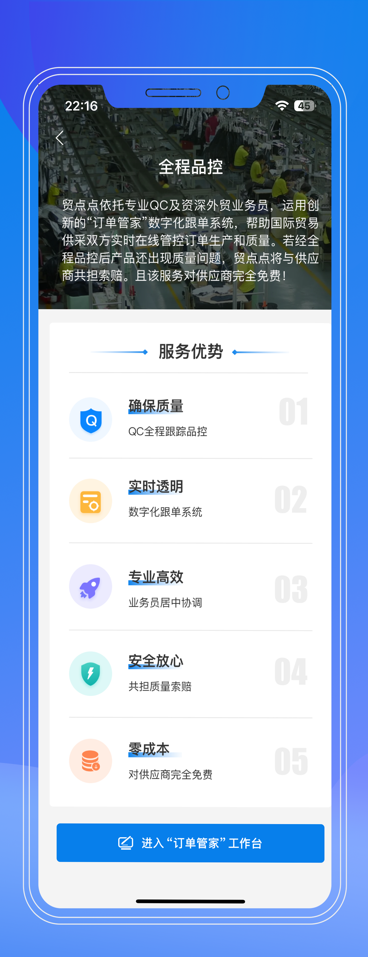 基于“网约QC”创新模式,贸点点升级推出“WeGuarantee全程品控”服务。结合先进的“订单管家”APP系统,免费帮助国内供应商管控质量,把好订单操作关、生产关和质量关,让采购商消除对质量水平的担忧,提升对供应商的信任感。